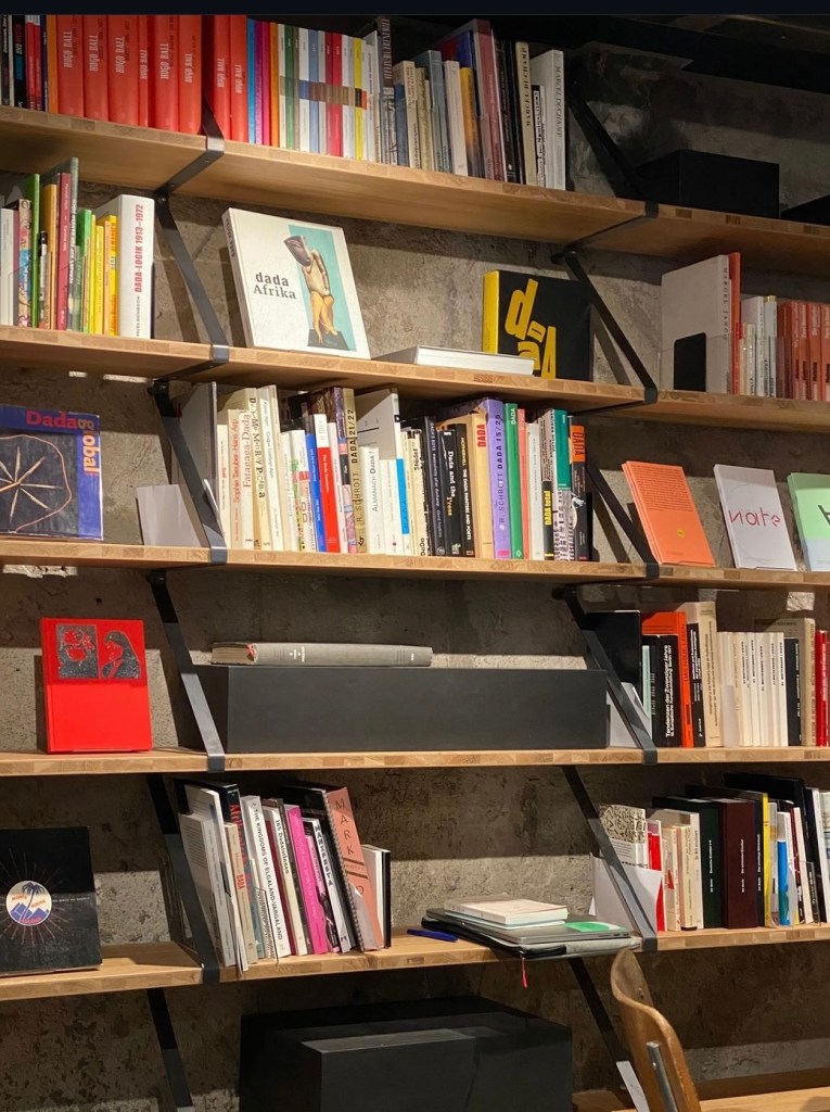 The Dada Library is located on the second floor of the Cabaret Voltaire. The library contains significant Dada-publications — including my novel in German, “Was schön war und gut.”